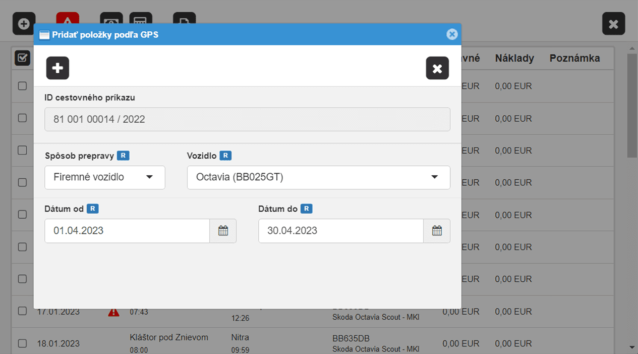 Evidencia každej jazdy: dátum, čas odjazdu a príchodu, trasa (miesto začiatku