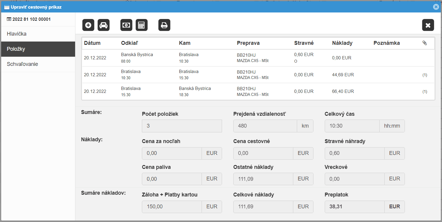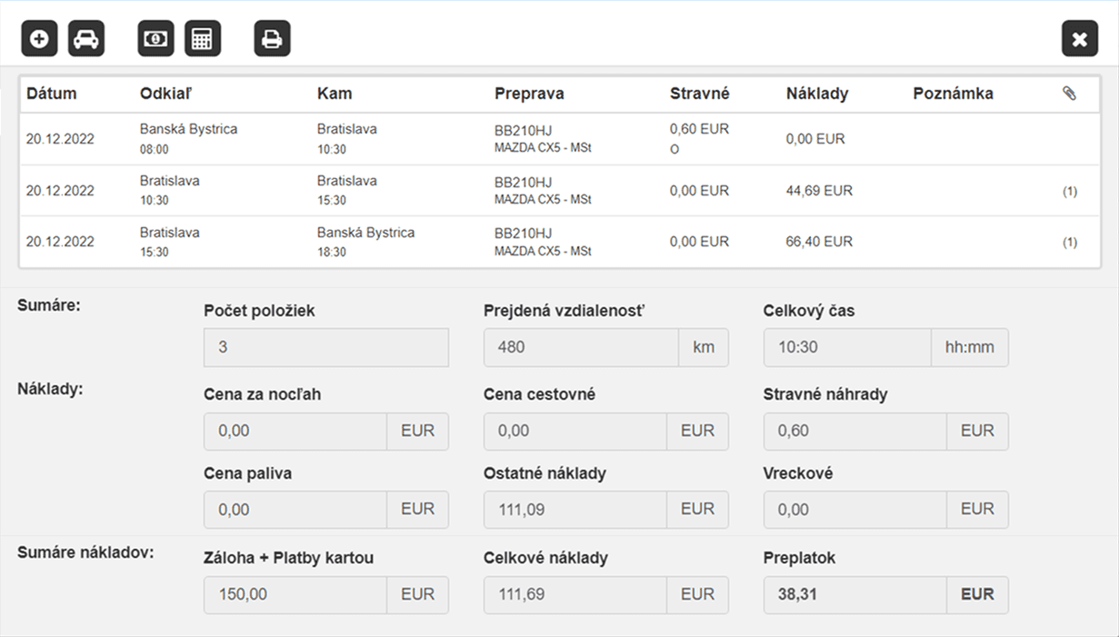 Vlastné kroky schvaľovania Legislatívny prepočet stravných náhrad, vreckového Vyúčtovanie náhrad pri jazde súkromným vozidlom Detailný prehľad nákladov v ľubovoľnej mene Archivácia priložených bločkov, faktúr